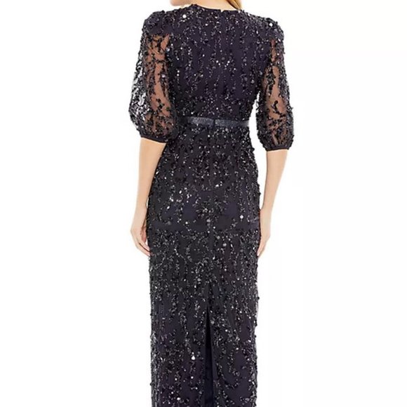 Showered in sparkling details and cut in a close-fitting sheath silhouette, this elegant gown will inspire toasts.