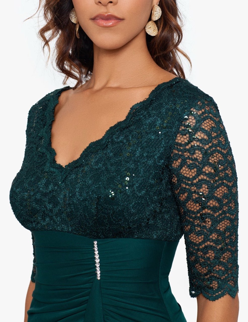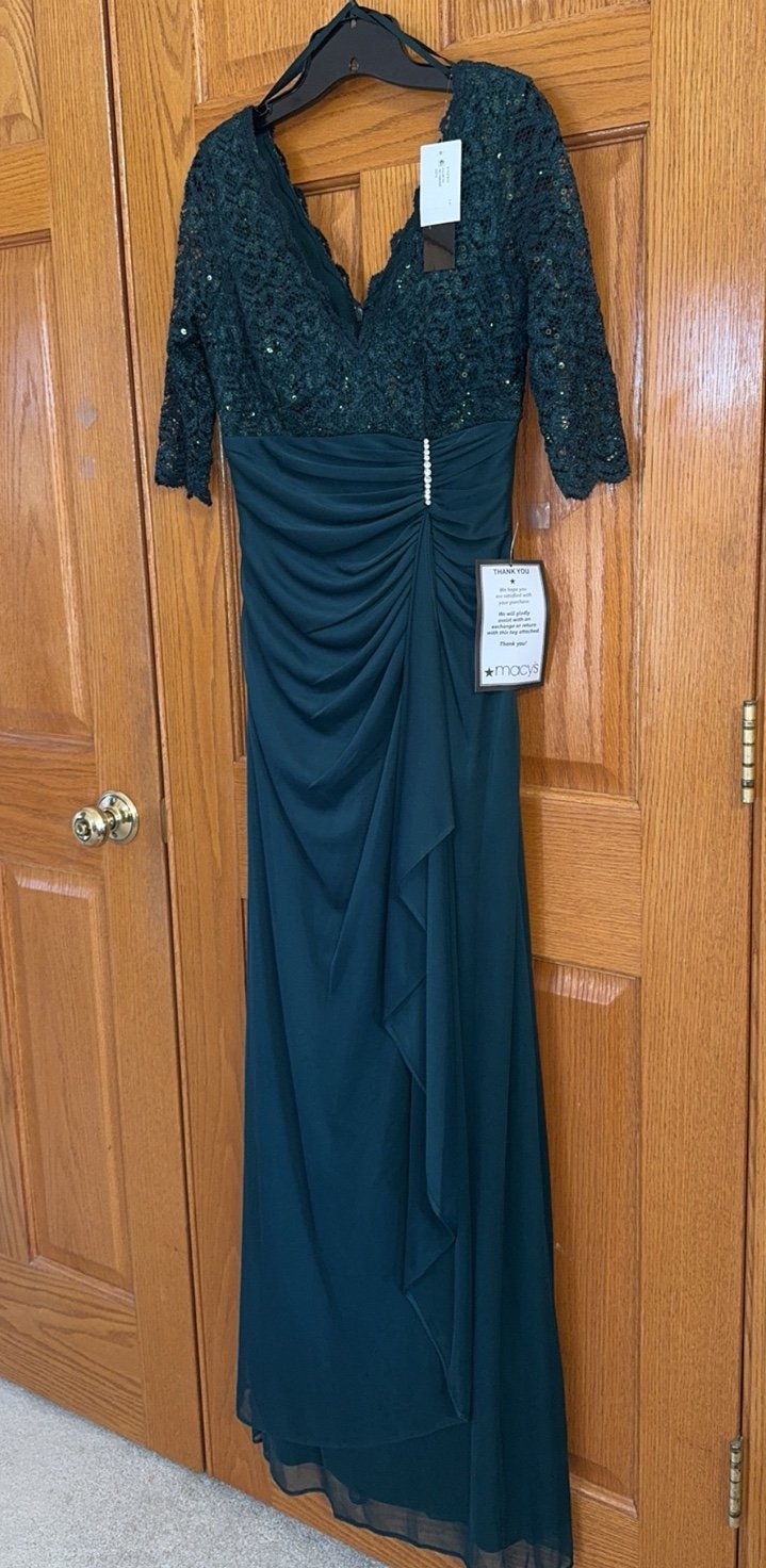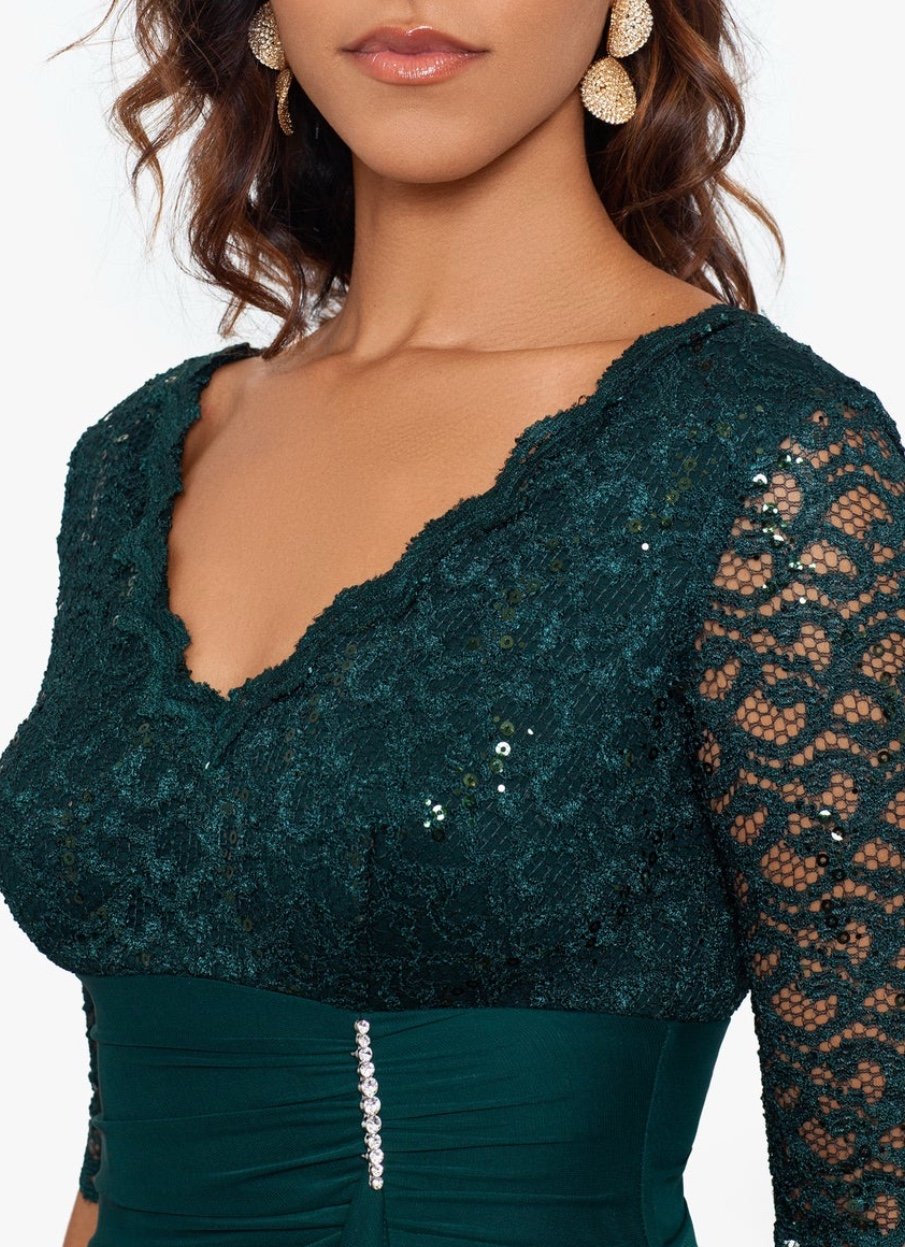 Details: 3/4 Sleeves, V-Neck, Side Ruche, Long Dress