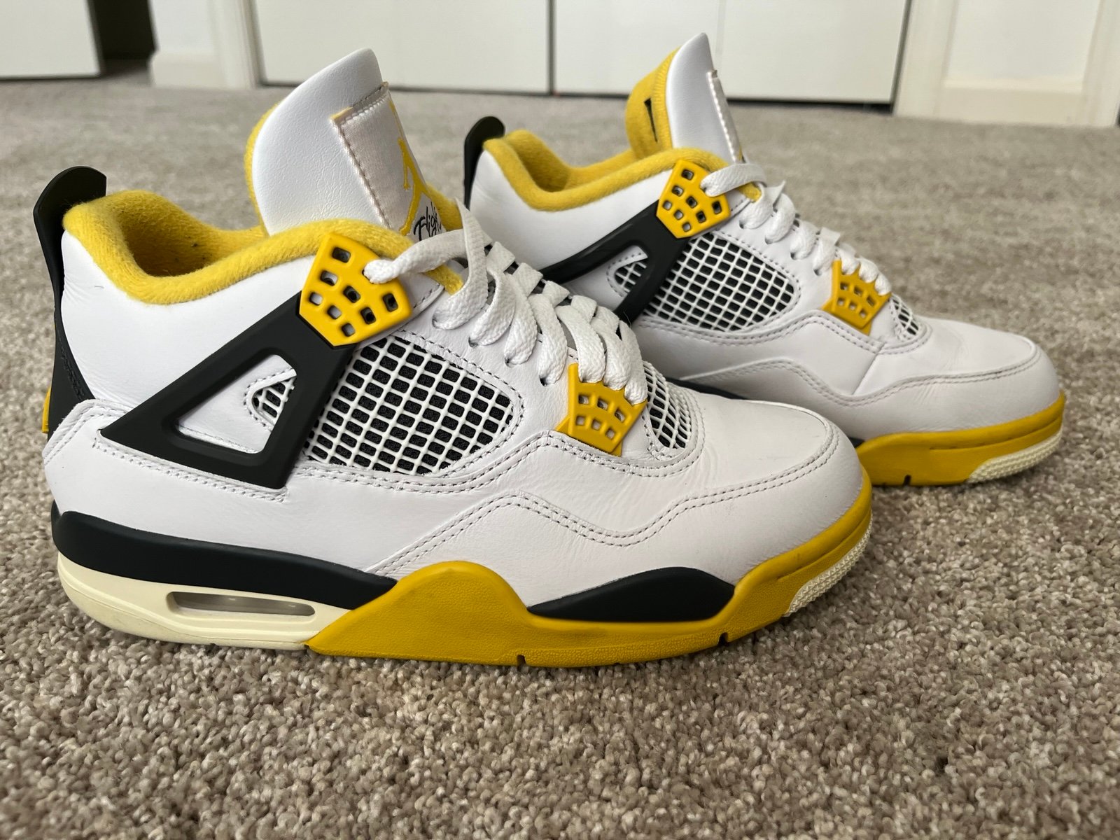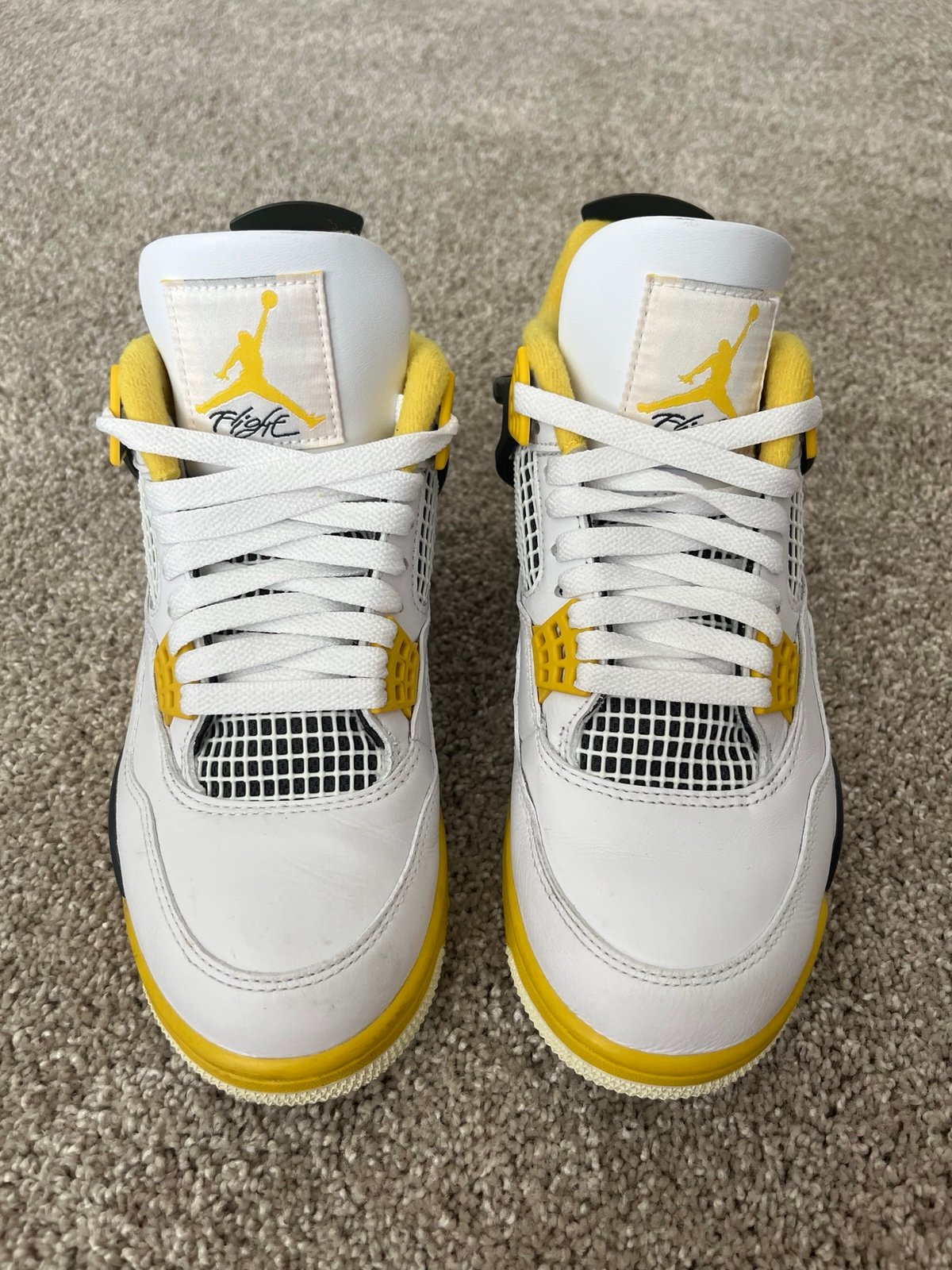 Women’s Nike Jordan 4 Retro in Vivid Sulfur, Size 7.5 in good shape. A small amount of creasing.